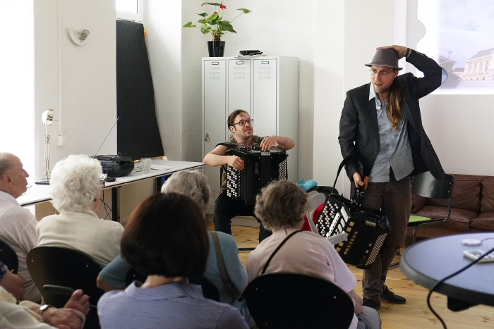 „Christian Zebisch (mit Hut) und ein Freund [Kevin Gajkowski] (?) führen einen erzählten und gesungenen Reisebericht auf für die Damen und Herren des Kaffeetreffs am Donnerstag der Volkssolidarität Pankow im Bürgerbüro [der Linken]“